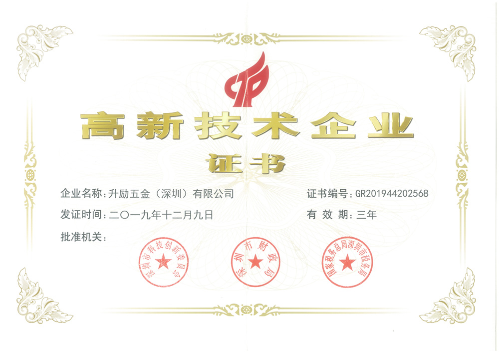 升勵(lì)五金(深圳)有限公司,獲得國(guó)家高新企業(yè)。